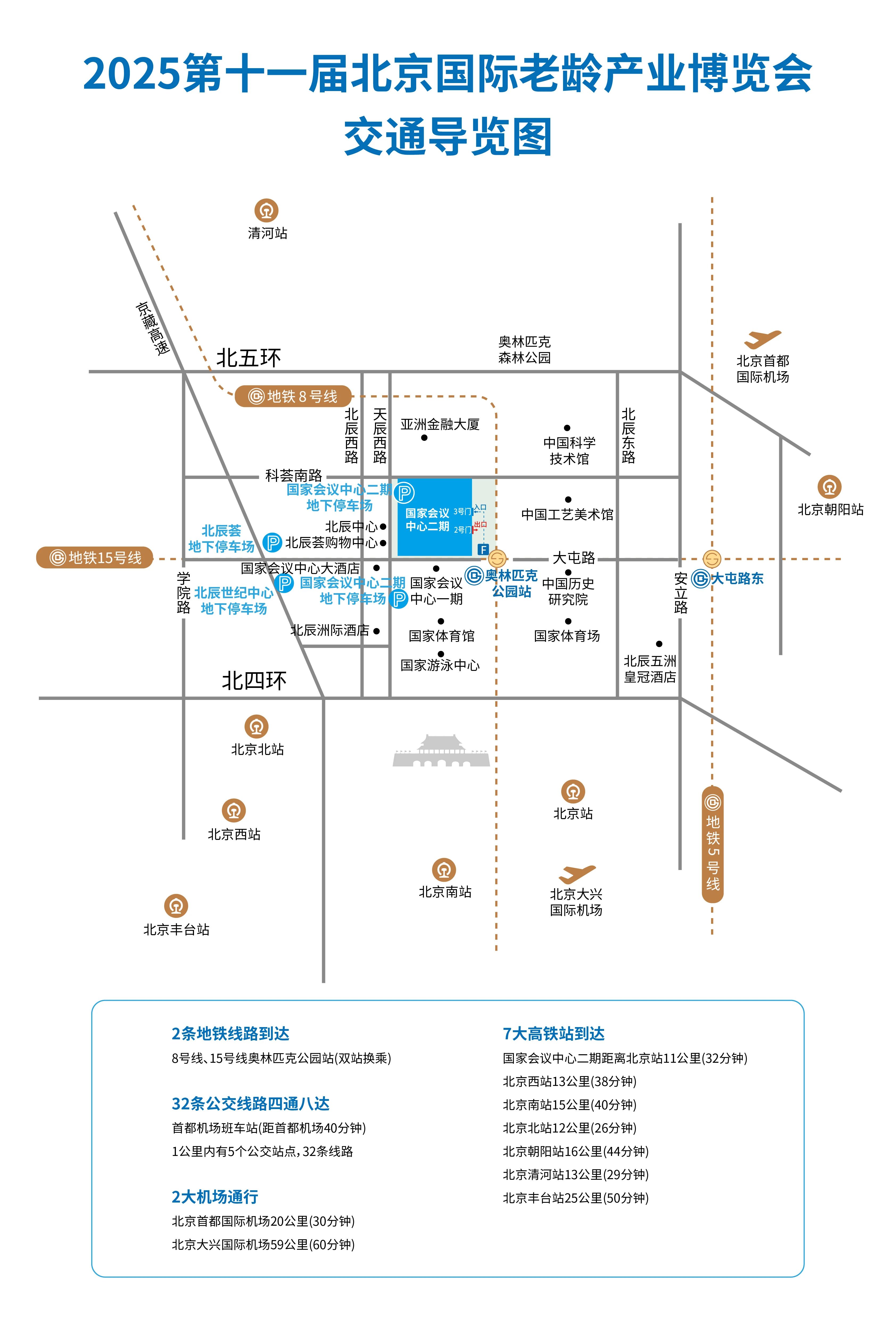北京地铁8号线、15号线至「奥林匹克公园站」出口F步行约100米可到达展厅入口步行导航地址:国家会议中心二期3号门。