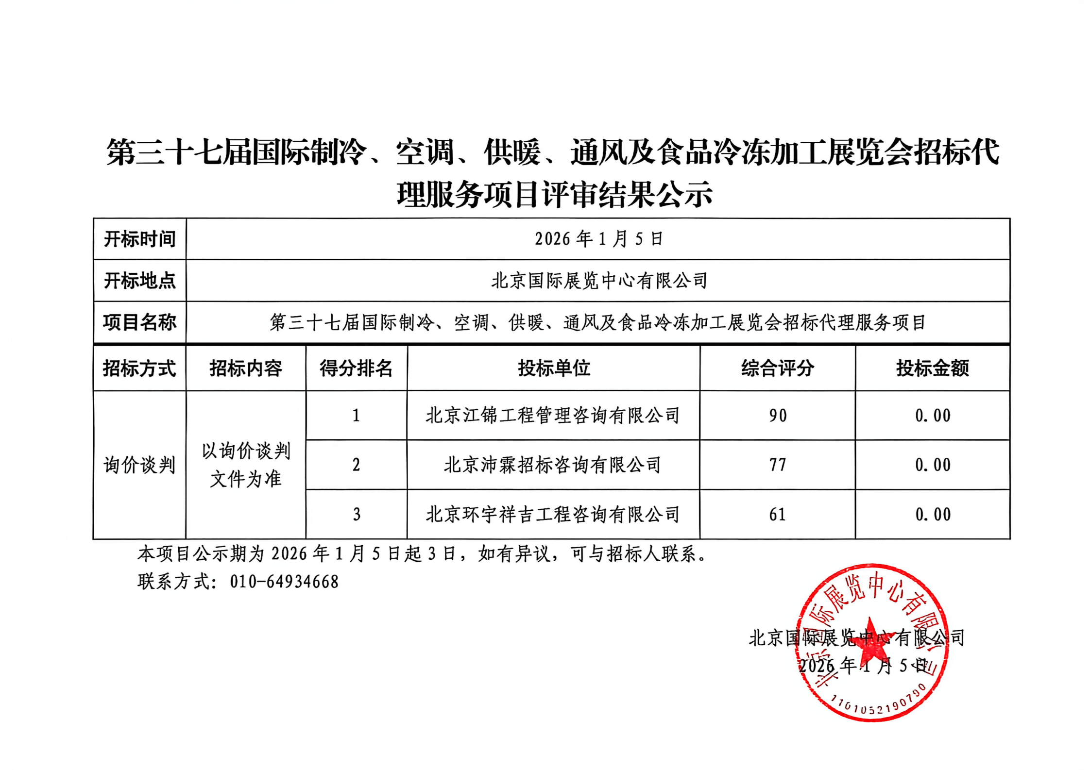 第三十七届国际制冷、空调、供暖、通风及食品冷冻加工展览会招标代理服务项目评审结果公示