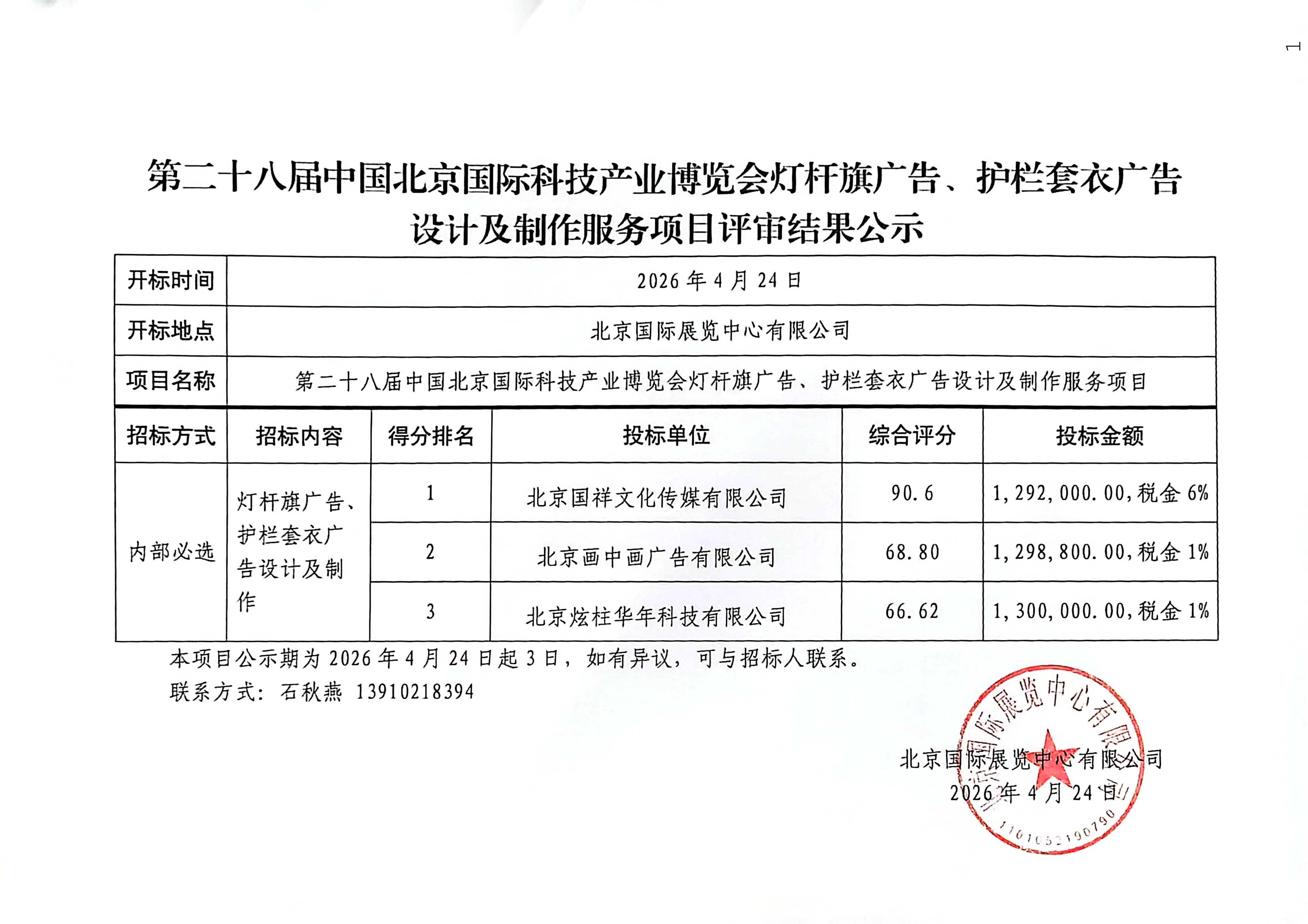 第二十八届中国北京国际科技产业博览会灯杆旗广告、护栏套衣广告设计及制作服务项目评审结果公示