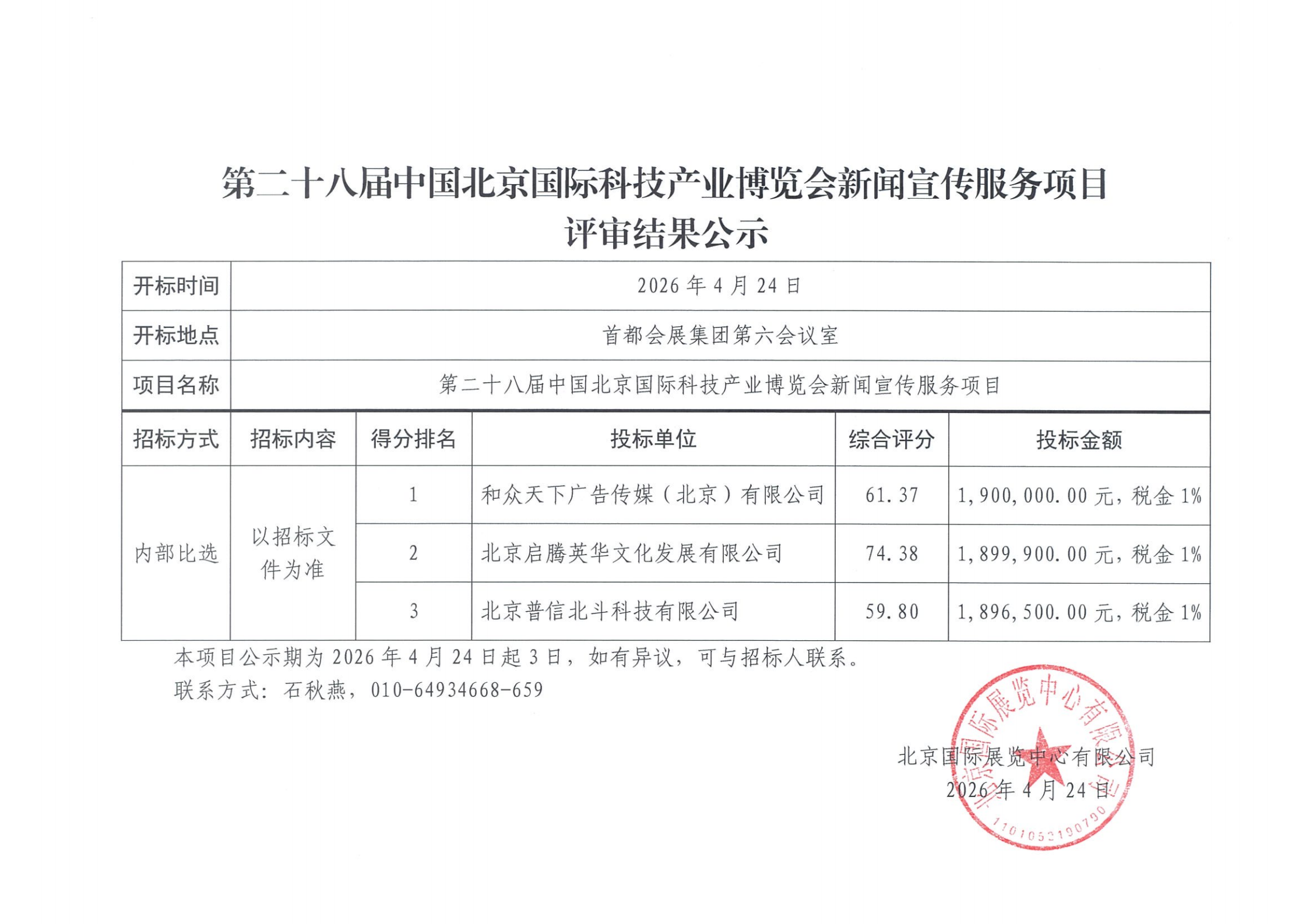 第二十八届中国北京国际科技产业博览会新闻宣传服务项目评审结果公示