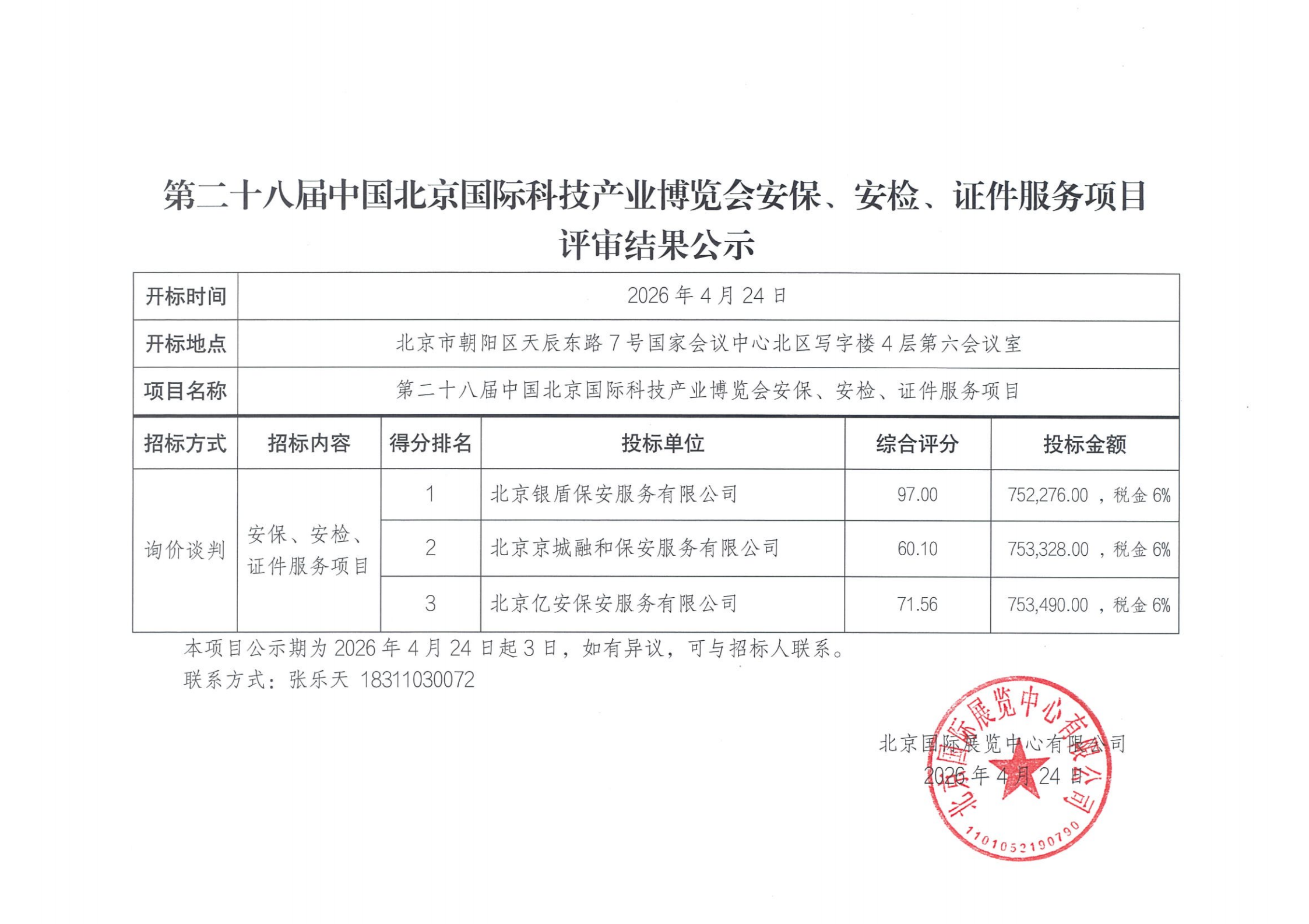第二十八届中国北京国际科技产业博览会安保、安检、证件服务项目评审结果公示