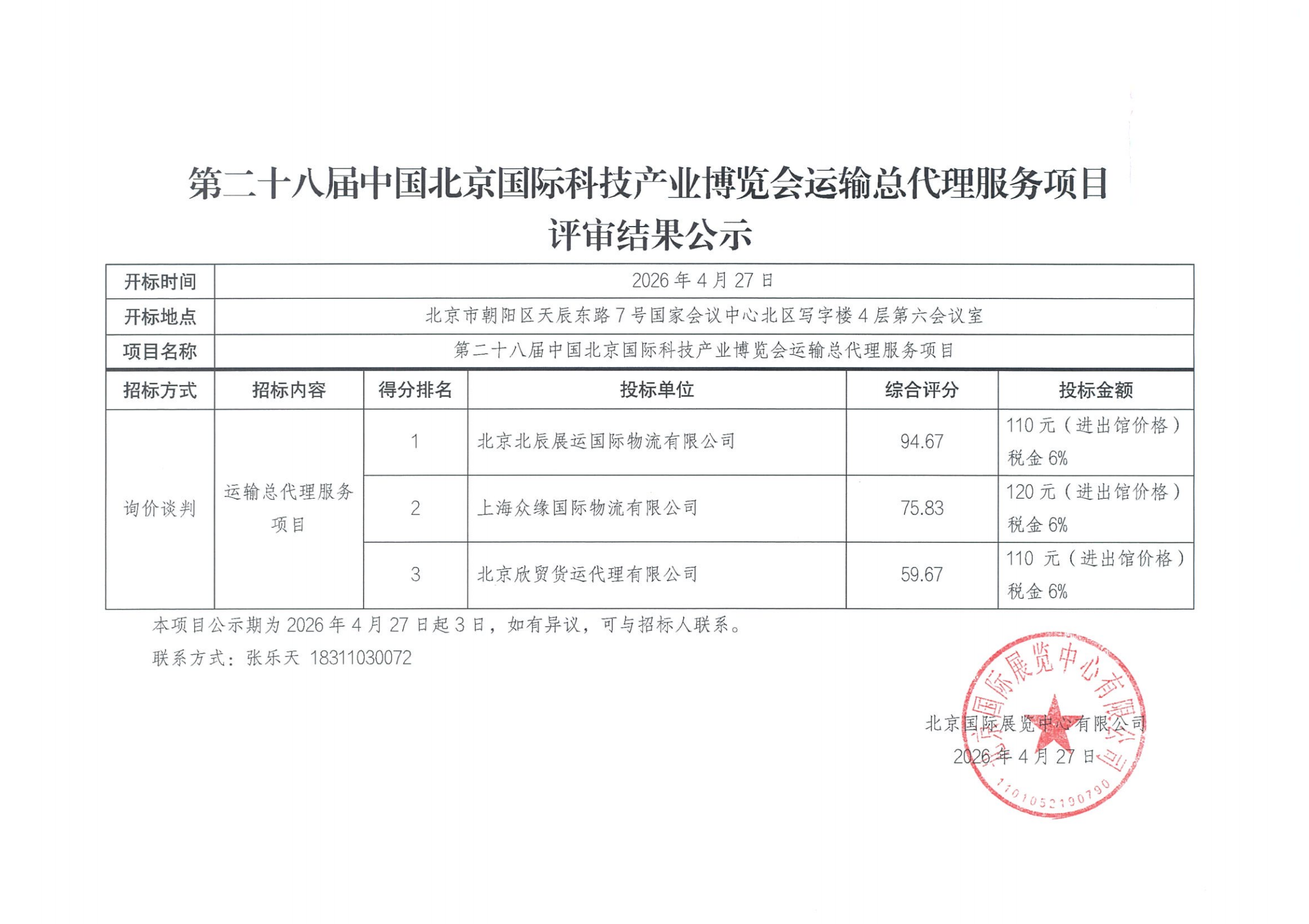 第二十八届中国北京国际科技产业博览会运输总代理服务项目评审结果公示